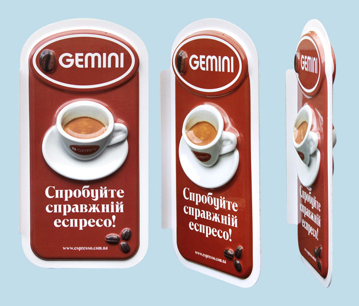 Формовка вакуумомЧтобы товар купить, его нужно заметить. Для этого придумано целое направление рекламы: POS - реклама в месте продажи. От недорогих "воблеров" до огромных стендов. Все это выдвигается вперед или вверх, двигается и мигает с одной целью - быть замеченным проходящим покупателем. Картонные рекламные конструкции непрочны и требуют частой замены. Сложные каркасные конструкции дорогостоящи. Есть ли "золотая середина"? Есть! Легкая и прочная бескаркасная объемная конструкция изготовленная по технологии вакуумного формования. Объем не только привлекает дополнительное внимание - он позволяет достичь прочности достаточной для долговременной эксплуатации. Малый вес такого рекламного изделия упрощает крепление - в большинстве случаев достаточно двухсторонней липкой ленты. Полноцветная высокоглянцевая печать усиливает заметность. Как это делаетсяРабота начинается с утверждения эскиза изделия Потом разрабатывается трехмерная модель После утверждения модели она изготавливается на 3D фрезерном станке. В это время происходит печать тестового Ч/Б листа. Дело в том, что пластик при формовании неравномерно растягивается. Тестовые листы позволяют увидеть в каких местах печать не совпадает с объемной формой и подкорректировать макет перед окончательной печатью. Окончательно откорректированный макет печатается на специальном пластике. Листы пластика формуются, обрезаются и, при необходимости, склеиваются в готовое изделие. У нас можно заказать объемные вывески, ценники, плакаты и даже магниты на холодильник. Весь цикл работ, включая фрезеровку матрицы и собственно формовку, производится на нашем оборудовании и нашими специалистами. Это позволяет жестко контролировать качество и обеспечивать минимальные сроки. Максимальный формат изделия 460х660 мм. |
